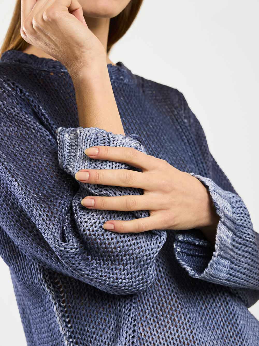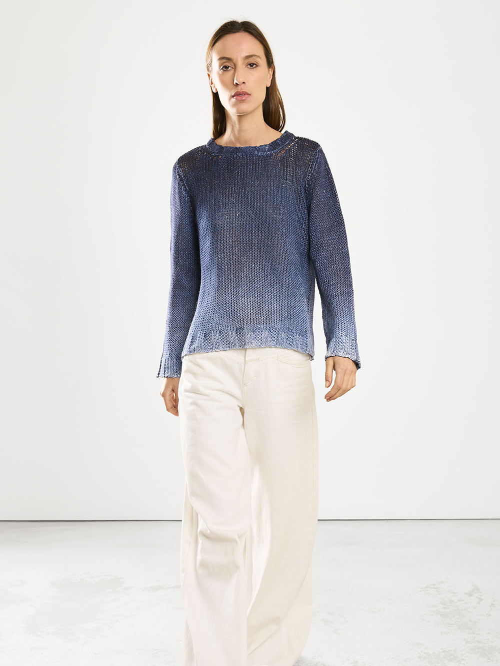 Maglia girocollo lavorata su finezza 5 a rete in cotone makò egiziano. Bordo in costa larga su polsini e collo.
