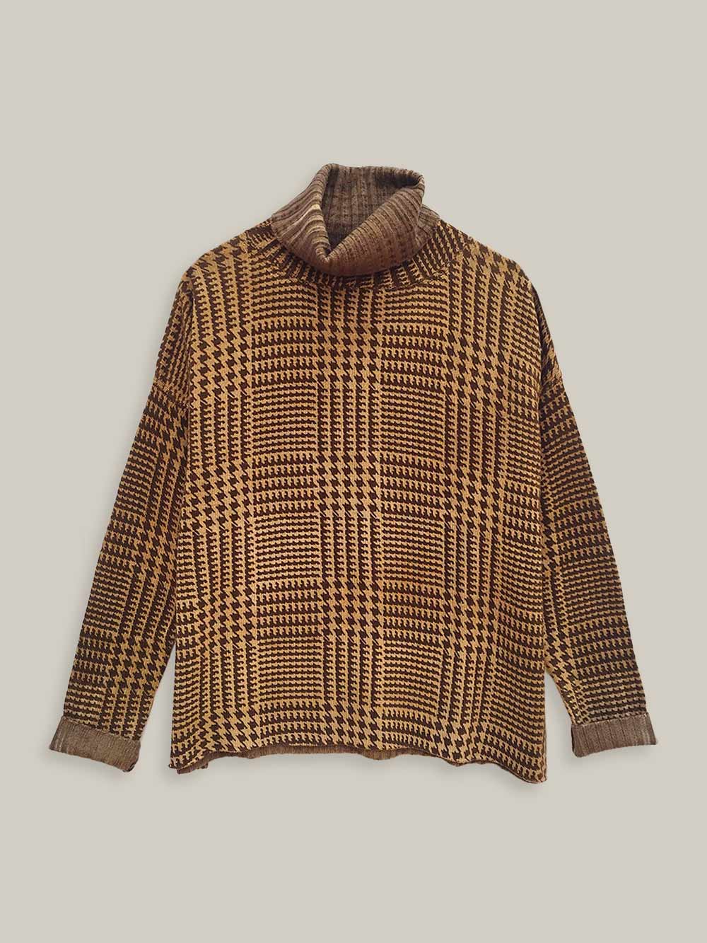 Maglia dolcevita lavorata su finezza 8 con maniche scese e rifiniture in rolotè sul davanti e costina sul retro. La vestibilità offre volumi oversized.