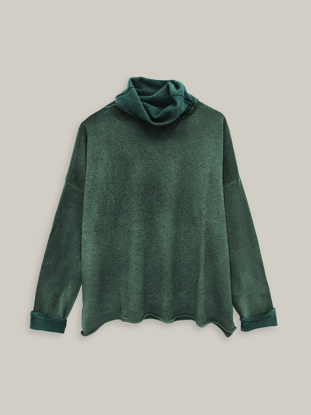 Maglia dolcevita lavorata su finezza 12  con manica scesa e rifiniture in rolotè. La vestibilità offre volumi oversized.