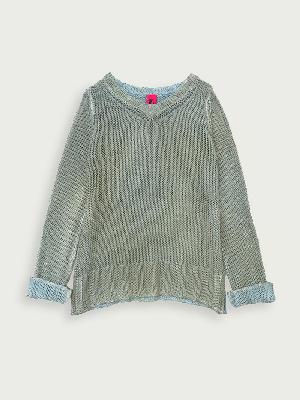 Maglia scollo V lavorata su finezza 5 a rete in cotone makò egiziano. Bordo in costa larga su polsini e collo.