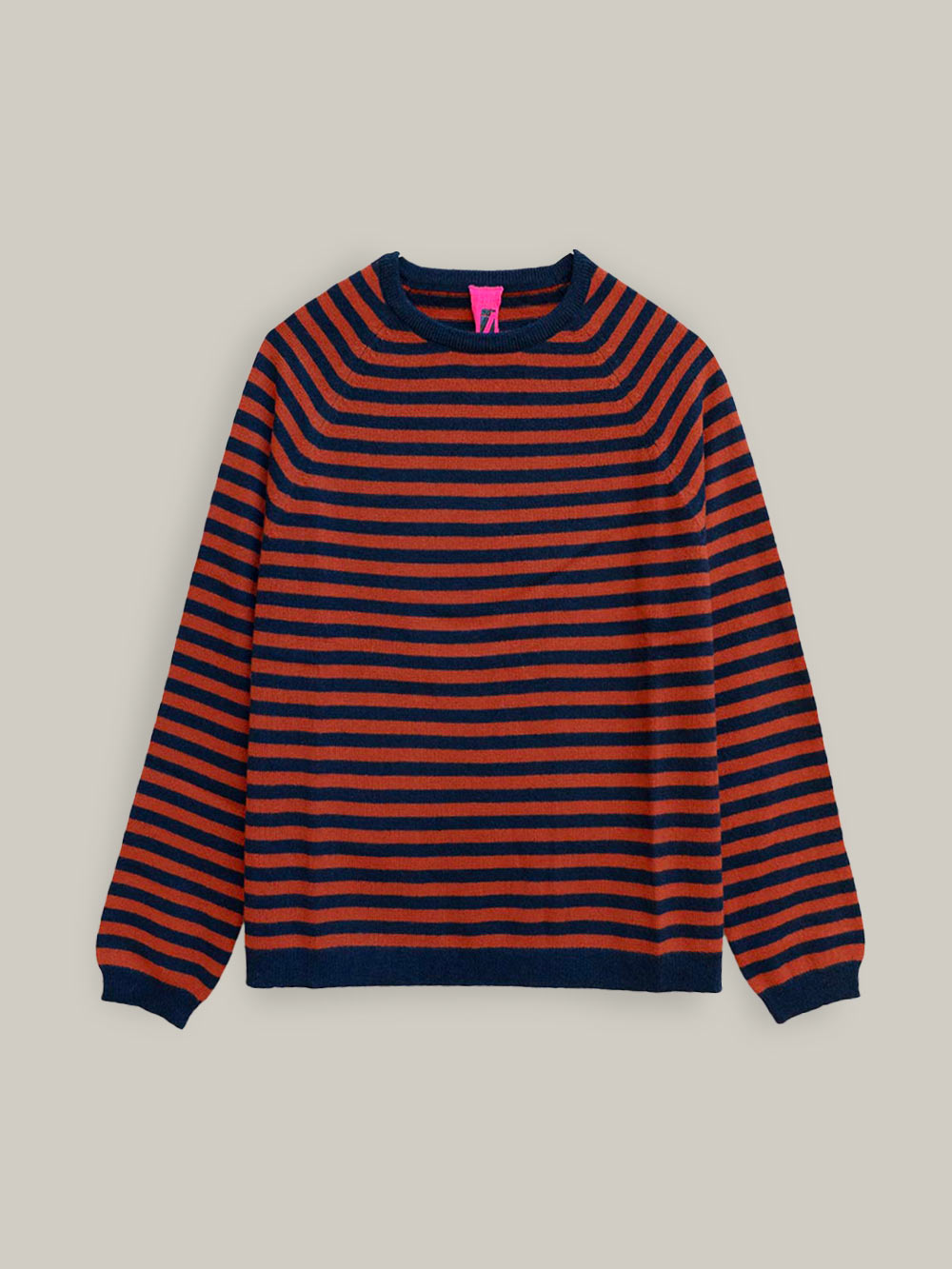 Maglia girocollo a righe lavorata su finezza 12 con manica raglan e spacchetti laterali. La vestibilità offre volumi regolari sia sul busto che sulle spalle.